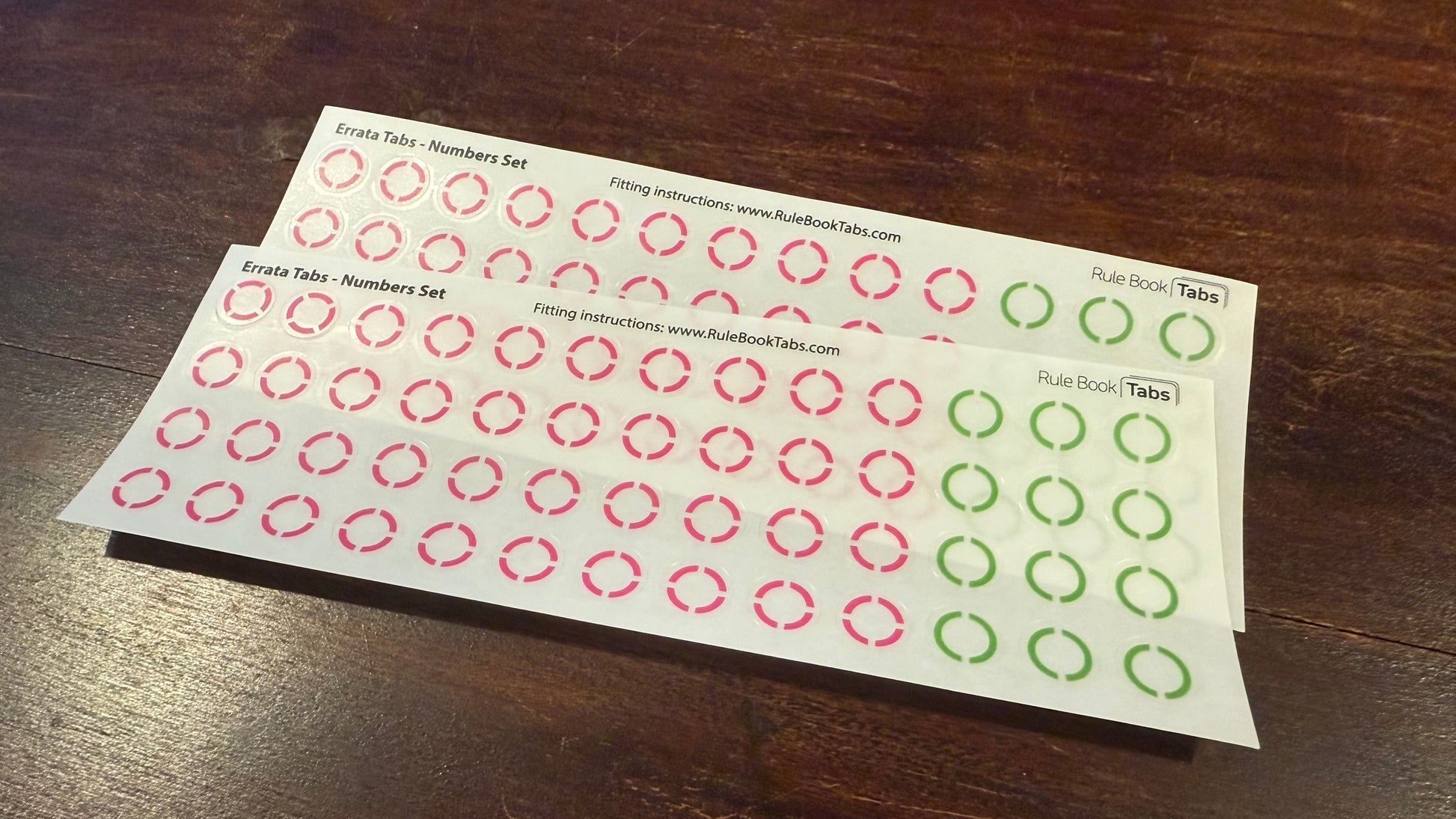 Errata Tabs highlight where rules have changed or been FAQ’d in your Rule Books, giving you a clear visual reminder so you never lose track of an update. The Errata Tabs Set includes self‑adhesive tabs to quickly flag these changes, while the Numbers Set lets you write directly on the tab for instant reference to the page in the errata document where the update appears, or to note statistic changes straight into the book.